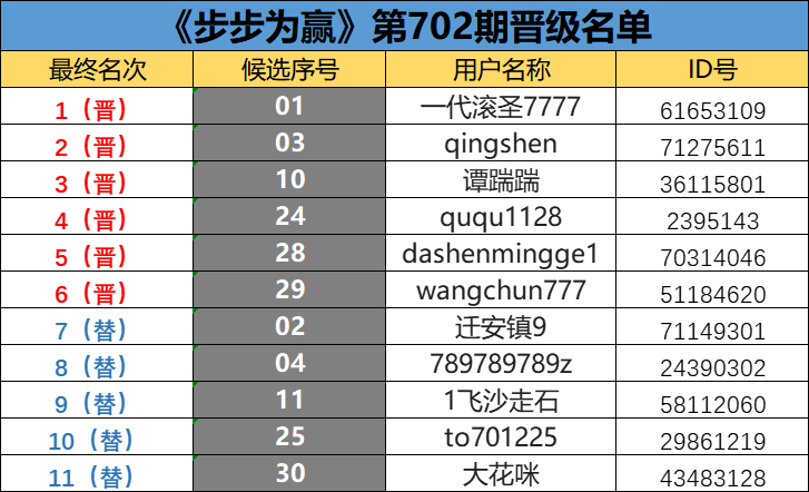 本期“双色球”开奖现场红球落球顺序依次为:01、03、10、24、28、29,因此在之前公布的候选名单中,候选序号与以上数字相同的选手将获得本期《步步为赢》晋级资格。6个晋级号码分别加1,分别为02、04、11、25、30的选手为替补选手。