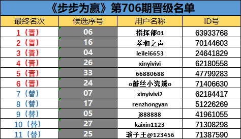 《步步为赢》第706期晋级名单公布
