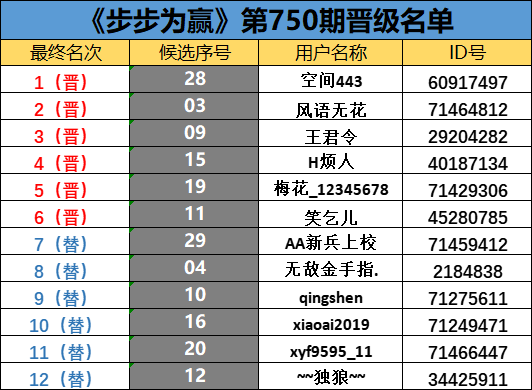 《步步为赢》第750期晋级名单公布