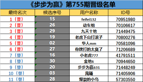 《步步为赢》第755期晋级名单公布