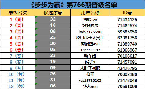 《步步为赢》第766期晋级名单公布