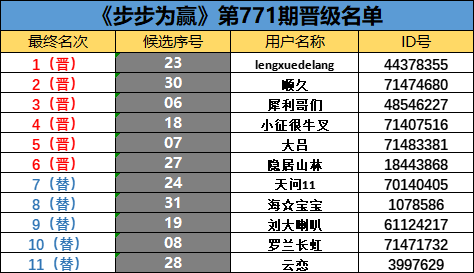 《步步为赢》第771期晋级名单公布