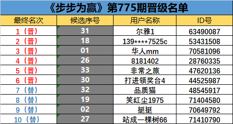 《步步为赢》第775期晋级名单公布