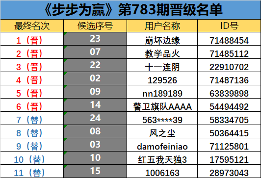 根据2023年5月4日中国福利彩票“双色球”玩法第23050期开奖结果,《步步为赢》第783期选手晋级名单已经产生。