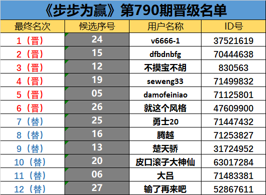 根据2023年6月22日中国福利彩票“双色球”玩法第23071期开奖结果,《步步为赢》第790期选手晋级名单已经产生。