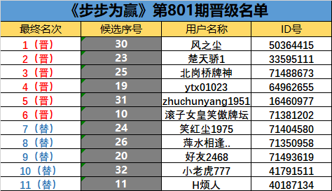 《步步为赢》第801期晋级名单公布