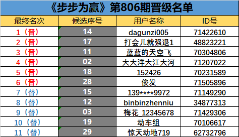 《步步为赢》第806期晋级名单公布