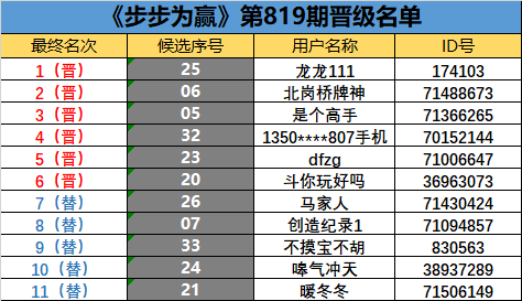 《步步为赢》第819期晋级名单公布