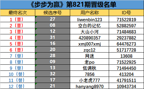 《步步为赢》第821期晋级名单公布