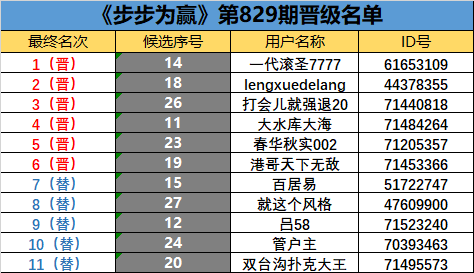 《步步为赢》第829期晋级名单公布