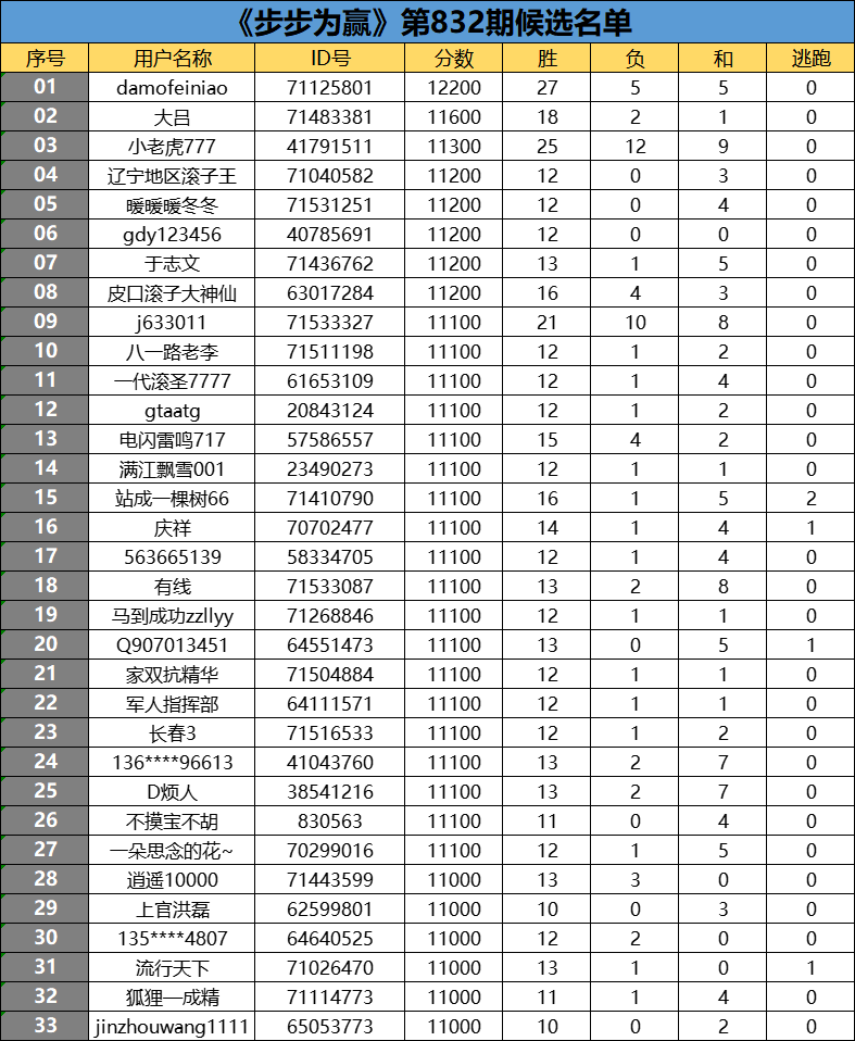 经过一周的激烈角逐,《步步为赢》第832期网络海选的33名候选选手已经揭晓。