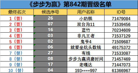 根据2024年7月11日中国福利彩票“双色球”玩法第24079开奖结果,《步步为赢》第842晋级名单已经产生。