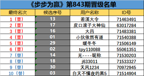 《步步为赢》第843期晋级名单公布