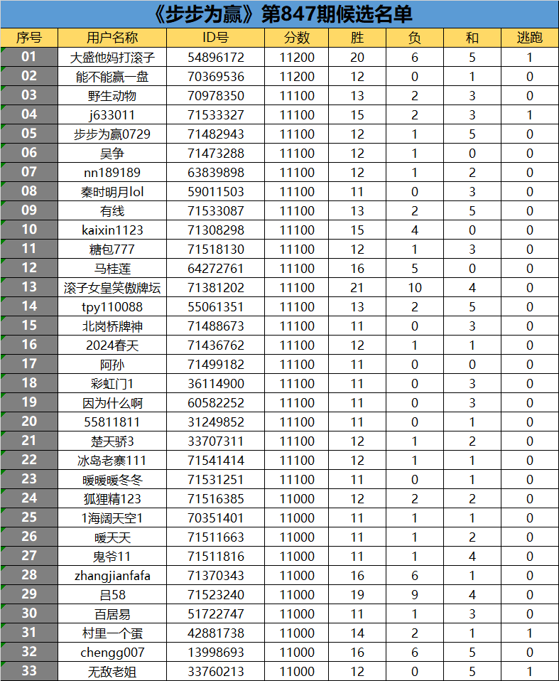 《步步为赢》第847期候选名单公布
