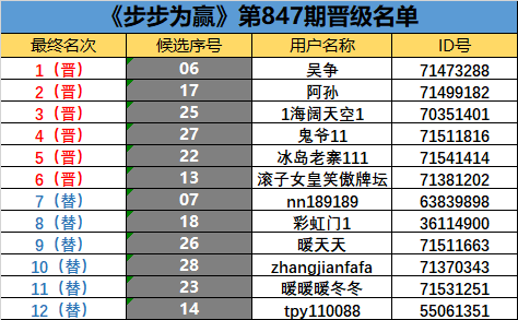 《步步为赢》第847期晋级名单公布