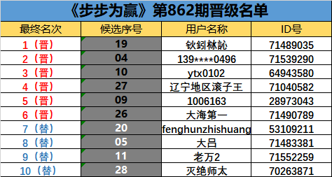 《步步为赢》第862期晋级名单公布