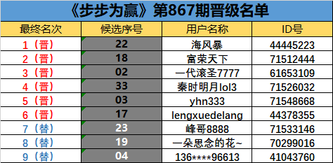 根据2025年1月2日中国福利彩票“双色球”玩法第25001开奖结果,《步步为赢》第867晋级名单已经产生。