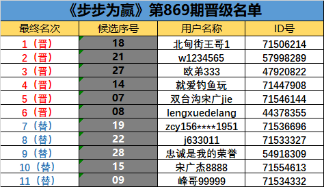 《步步为赢》第869期晋级名单公布