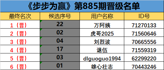 《步步为赢》第885期晋级名单公布