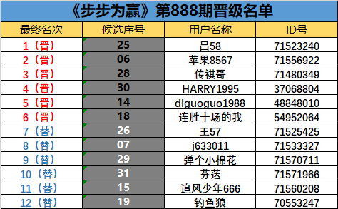 根据2025年5月29日中国福利彩票“双色球”玩法第25060奖结果,《步步为赢》第888晋级名单已经产生。