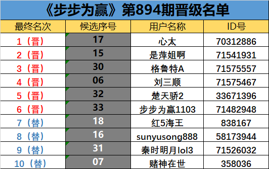 根据2025年7月10日中国福利彩票“双色球”玩法第25078奖结果,《步步为赢》第894晋级名单已经产生。