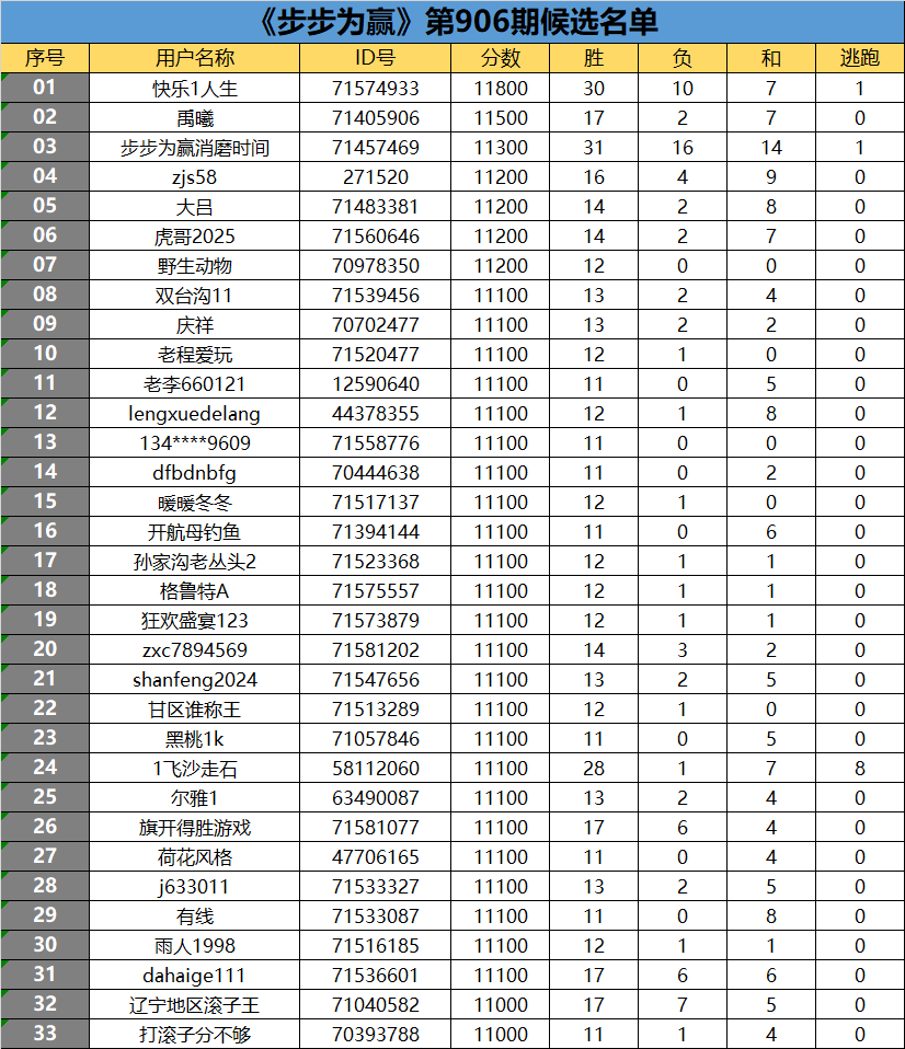 经过一周的激烈角逐,《步步为赢》第906期网络海选的33名候选选手已经揭晓。
