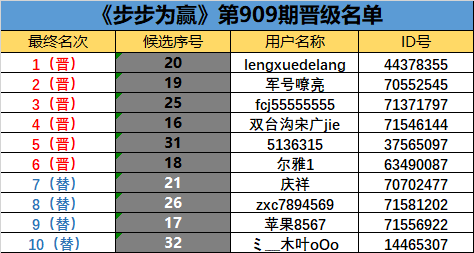 《步步为赢》第909期晋级名单公布