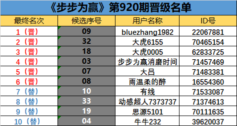 《步步为赢》第920期晋级名单公布